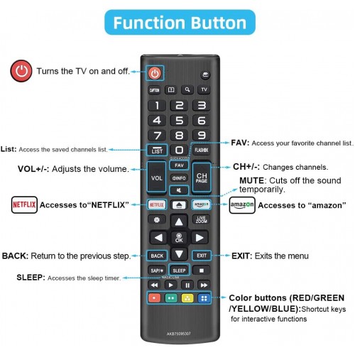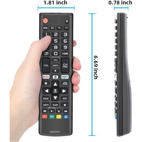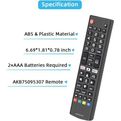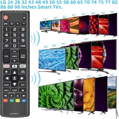 - AKB75095307 Remote Replacement for LG LCD LED 3D Plasma HD 4K UHD Smart TV LJ UJ Series Television Remote control.Compatible with LG 24 28 32 43 48 49 50 55 58 60 65 70 74 75 77 82 86 88 98 inches Smart TVs.with Netflix and Amazon Button.