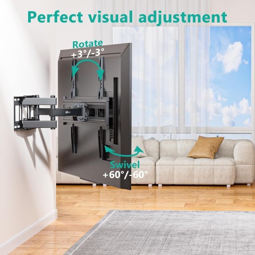 - Fully Adjustment: Dual articulating wall mount arms allow +3°/-15° tilt, +60°/-60° swivel and +3°/-3° leveling. Extension from the wall: 2.6"~14". Adjust the viewing angle flexibly and smoothly according to your needs.