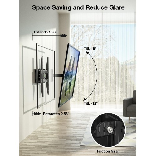- SPACE SAVING - Dual articulation arm design ensures reliable strength, this articulating tv mount can retract 2.58 inch from the wall in home position to save space and also extends up to a maximum 13.89 inch from the wall, cable strap included to manage TV cables, perfect for creating a clean, minimalist look in your living space.