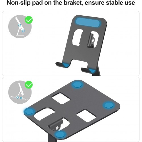 - A non-slip silicone pad is used on the contact surface with the phone, which can be placed horizontally to prevent dropping and superior stability. It can also prevent scratches to the equipment and provide safety protection against scratches to the phones. The surface of the stand base is also made of non-slip silicone, which can be firmly attached to the table to improve the stability of the stand.