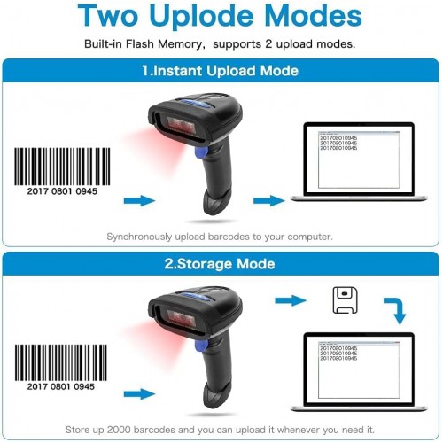 - Automatic Scanning: NT-1228bc barcode scanner have three scanning modes: manual trigger mode, continuous scanning mode and auto-sensing scanning mode. In addition, there is a storage mode. Storage mode can be used when you are out of range of Bluetooth and wireless connectivity. Supports storage of up to 100,000 barcodes. Note: Before use, you need to scan the corresponding setting barcode on the manual.