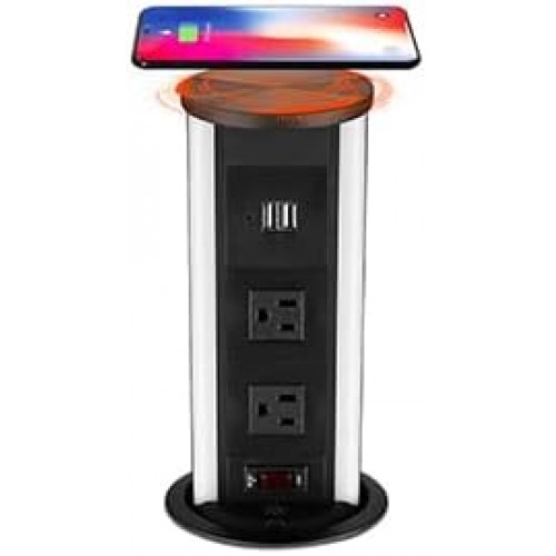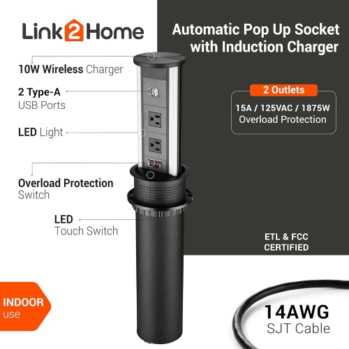 Tags: Link2Home Automatic Pop Up with 10W Induction Wireless Charger, 2 Power Outlets 15A, 2 USB Ports 3.4A, Splash Resistant, Black Anodized Finish, for Kitchen Counter Island, Office Table and Workshop