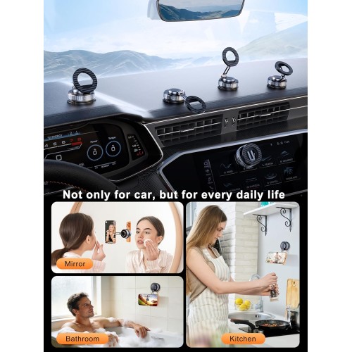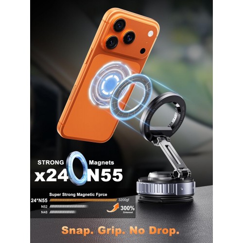 - Stronger Grip, Smarter Hold: With 24 high-performance N55 magnets, this suction cup phone mount delivers 320% stronger magnetic force than basic mounts, generating up to 3,000 GF of magnetic power—enough to hold 60 phones. It passed 8,000+ vibration tests and extreme road simulations, keeping your phone secure even on bumpy roads, during sudden stops, or sharp turns. The precision magnetic array ensures zero signal interference for seamless navigation and crystal-clear calls.