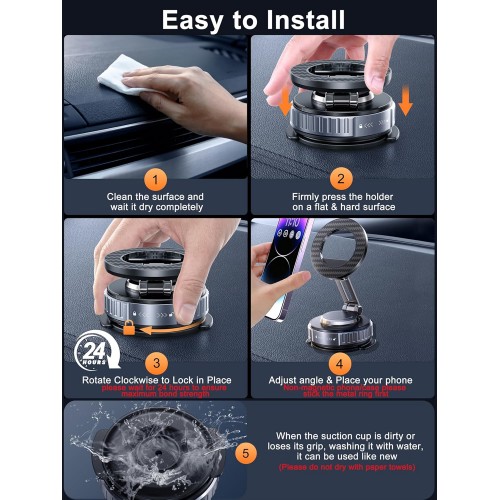 - Powerful Suction, Rock-Solid Hold: This vacuum magnetic phone holder features a 4-layer high-strength nano gel suction cup with rotating vacuum-lock technology, supporting up to 108 lbs (49 kg) and gripping firmly through extreme temperatures (-40°F to 300°F). After 9,999+ durability tests and 300+ reattachments, just rinse the cup with water, let it air dry, and it regains ~99% of its suction power—back to like-new stability. (Please do not dry with paper towels.) Especially, This car mount has two larger tabs, giving your fingers plenty of room to grip it touching or damaging the nano gel suction cup.