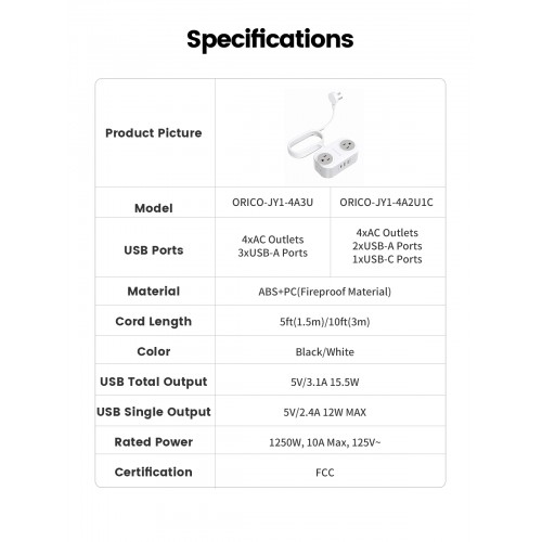 - 【7-in-1 Power Strip with USB-C Port】OIRCO extension cord with USB ports has 4 AC power outlets, 2 USB-A ports, and 1 USB-C port. The small extension cord with multiple outlets can support 7 electronic devices at the same time, such as cell phones, iPads, laptops, desk lamps, cameras, and other devices. (The voltage of the ORICO extension cord is 125V. If your device does not support 125V, you will need a transformer and adapter to use this strip.)