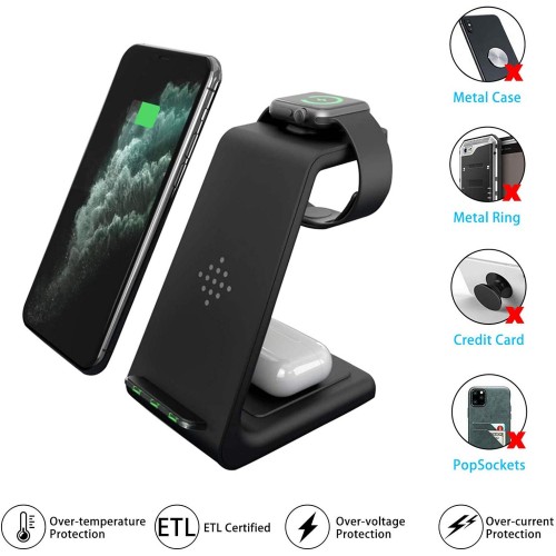 - 【3 in 1 Wireless Charger】 wireless charger stand is saving space on your desk thanks to its small footprint design. Instead of having multiple cords for iWatch and AirPods, use one type C cable and a quick charge 3.0 adapter (both included). Our charging dock station is suitable for both home and office and gives you genuine wireless experience.