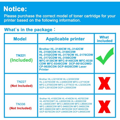 - 【Reliable Quality】LCL TN221 Magenta toner cartridge uses high quality toner, toner particle size distribution, good mobility, high transfer rate, resulting in a clear image and high gloss print effect; Printing efficiency is high, waste powder rate is low, so as to ensure sufficient page yield.