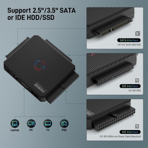 - 【Supported HDD/SSD】FIDECO IDE and SATA adapter is compatible with 2.5”/3.5” SATA/IDE hard drives. It can support the connection of 3 hard drives simultaneously: one 2.5” IDE, one 3.5” IDE, one 2.5”/3.5” SATA.