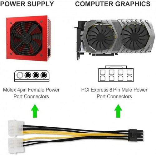 - 8-pin PCI express power cable adapter connects a PCIe video card with an 8 pin connector to a power supply with two spare L4 Molex power connections; Check that your PSU is rated to power the video graphics card.
