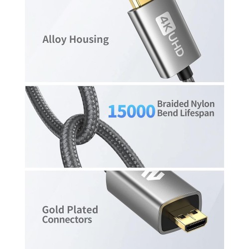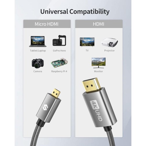 Tags: Micro HDMI to HDMI Cable 6.6ft, [Gold Plated, Sturdy Aluminum] Supports 4K@60Hz, HDR, Ethernet, ARC, Compatible with Raspberry Pi 4, GoPro Hero 3/4/5/6/7, Cam Link 4K, Sony A6400 A6000 Camera