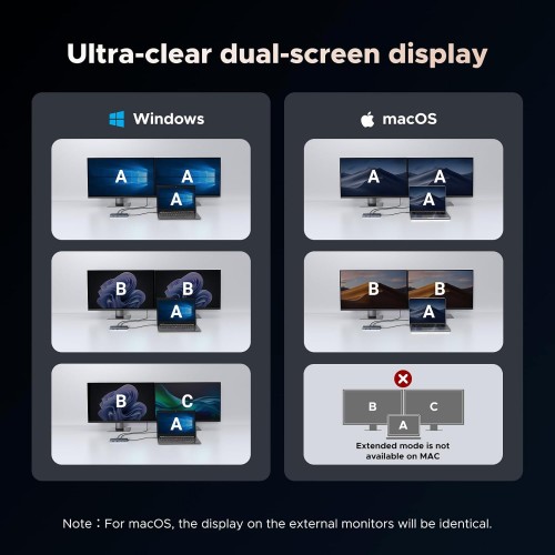 - Dual 4k HDMI Docking Station: The Docking Station will hook up two displays to both HDMI ports in 4K@60Hz max. Please note that due to MacOS limitations, all extended monitors will display the same content when connecting MacBooks