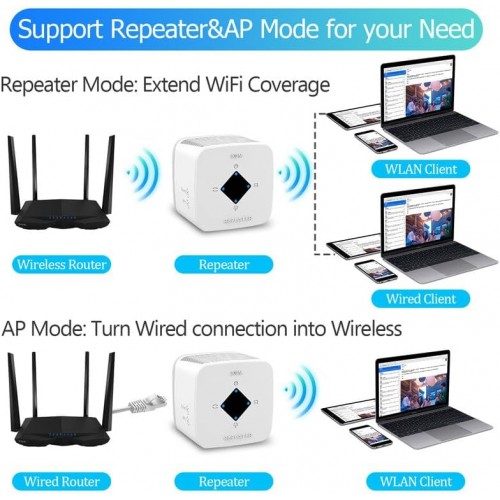 - Repeater Mode/AP Mode: Wi-Fi Extender has Repeater/AP mode, Ethernet Port can easily turn your wired Internet connection into a access point. most home users will set it up in one of two ways: Range extender (it connects to your existing network and enhances/extends the signal) or Access Point (it connects to the Internet or your existing network via Ethernet and then broadcasts the wifi signal.
