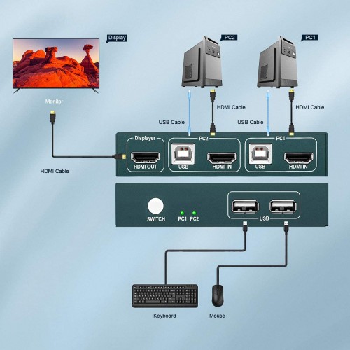 Tags: KVM Switch HDMI 2 Port Box, UHD 4K@30Hz & 3D & 1080P Supported, No Power Adapter Required, with 2 USB and 2 HDMI Cables
